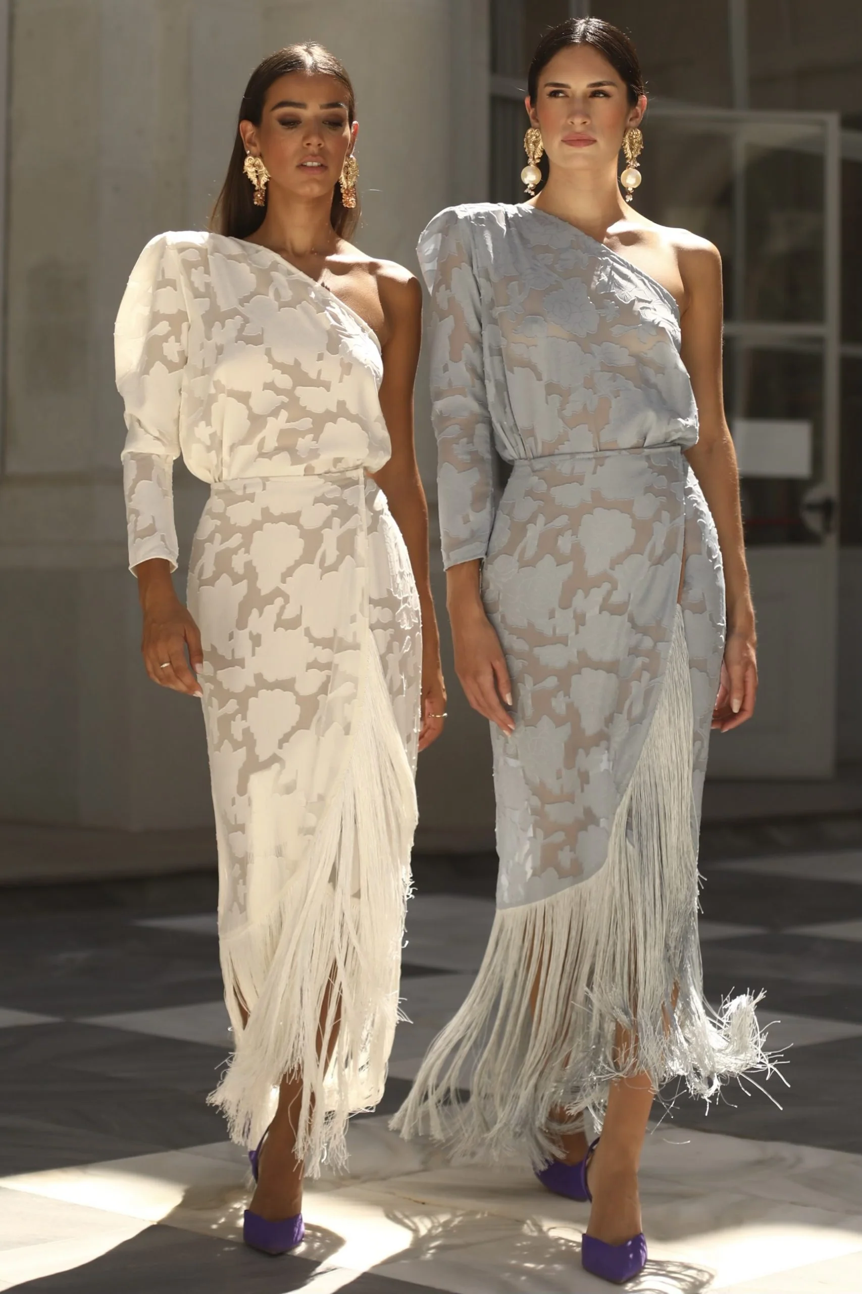 Dos piezas asimetrico con espectacular manga de gasa y falda de flecos. Vestidos confeccionados y elaborados en España. Composición 100% poliéster.