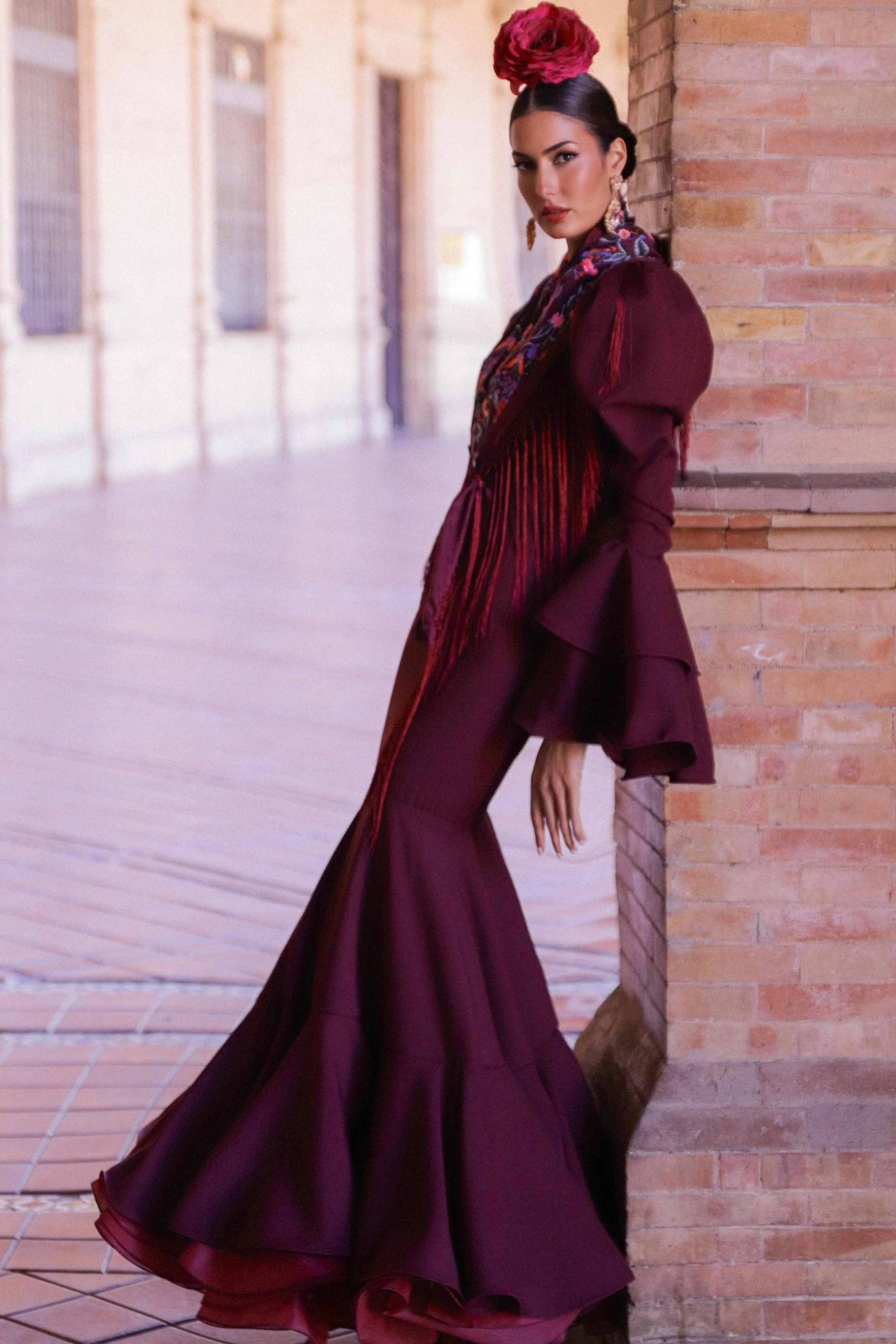 Vestido de flamenca espectacular con mangas abullonadas rematadas en grandes volantes. Falda con gran vuelo, de corte canastero, y relleno de cancán. Escote delantero bajo y espalda baja hasta la cintura. Forro interior. Diseñado y fabricado en Sevilla, España.