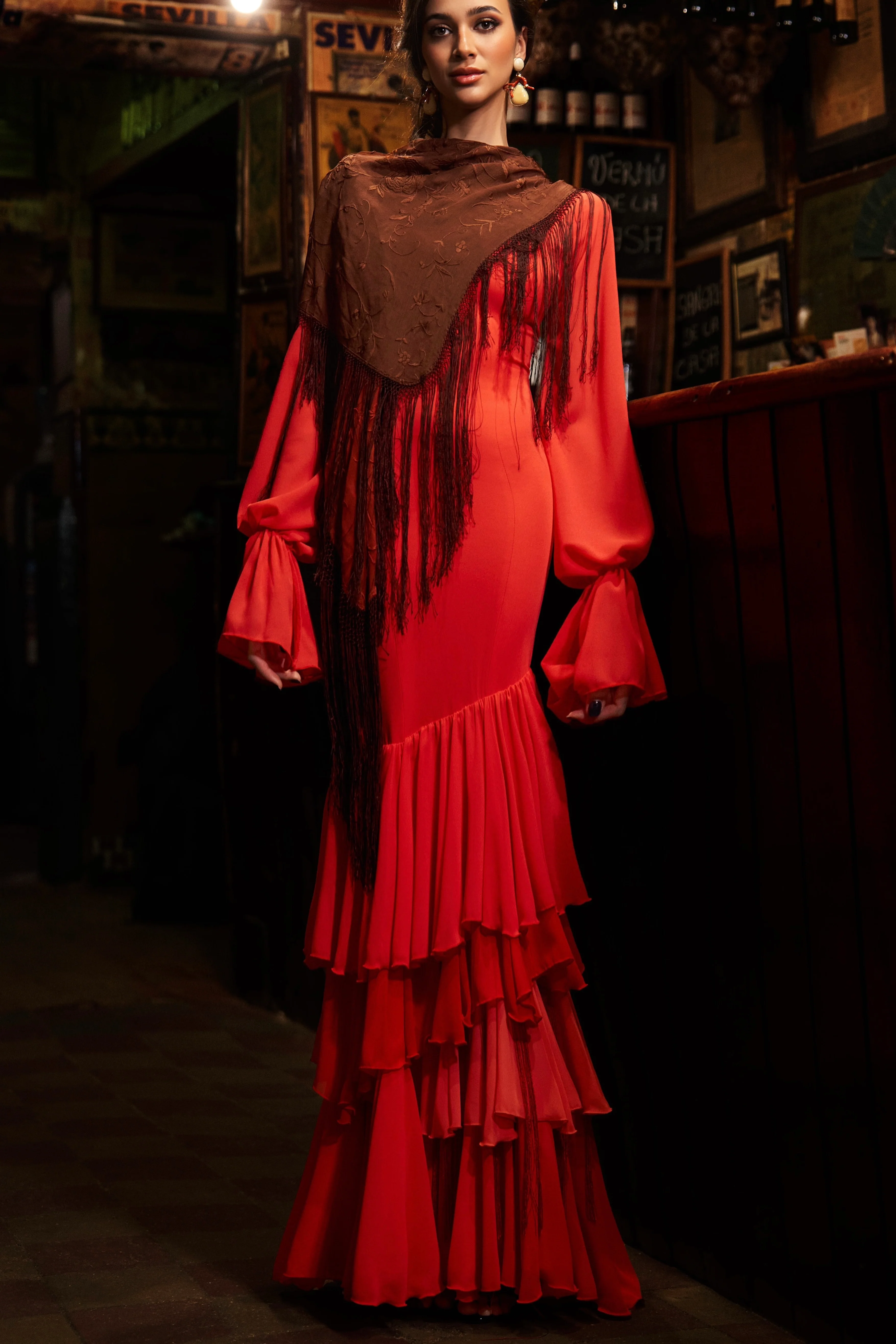 Maravilloso traje de flamenca de la Colección cápsula de VictorioyLucchino x Sibilina, combinado con volantes de gasa en varios tonos y detalle de flecos de seda. Espectaculares mangas.