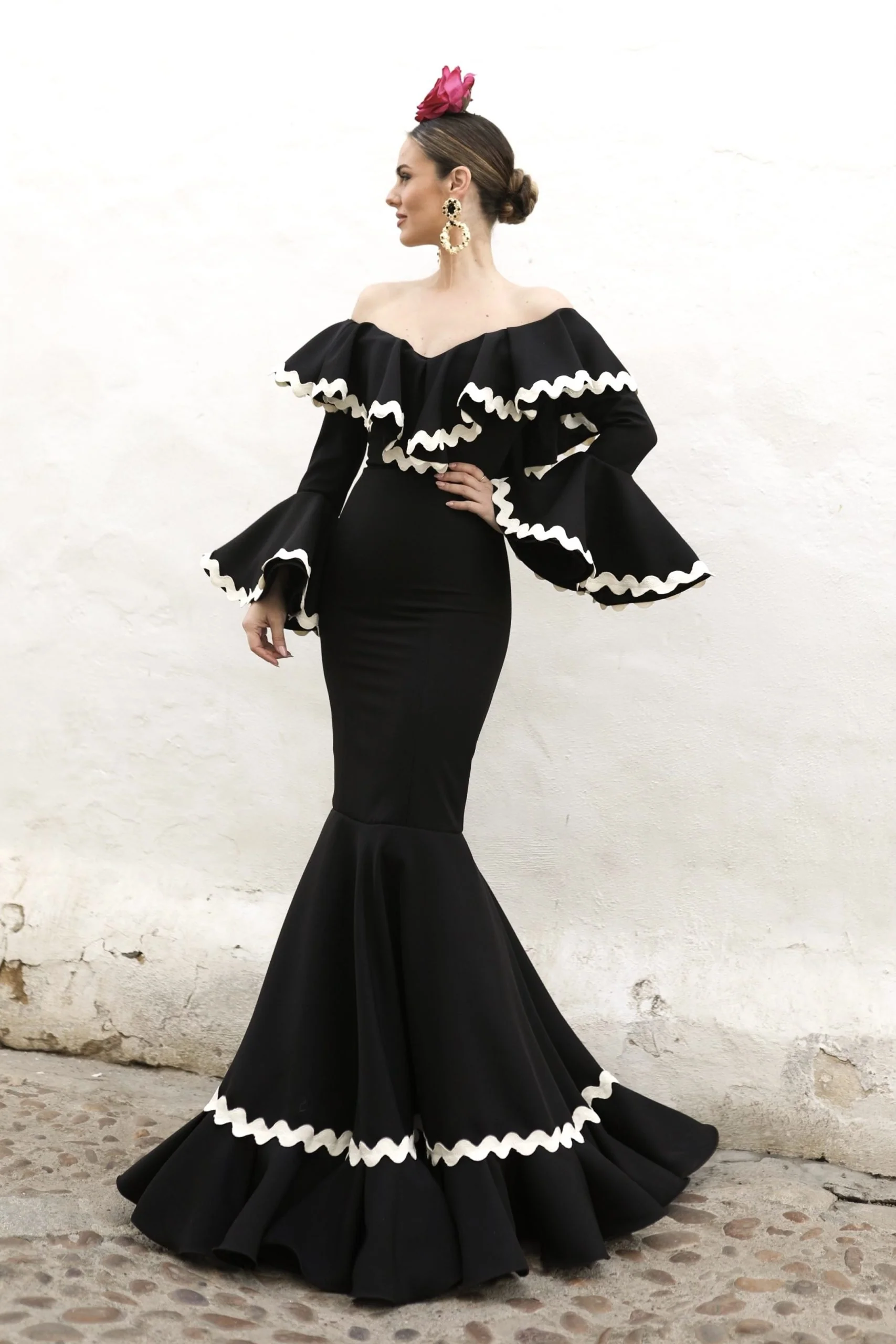 Traje de escote delantero medio con volante completo con zig zag en beige o negro. Mangas al codo con volantes con zig zag. Falda de volante en capa también con zig zag. Diseñado y fabricado en España.