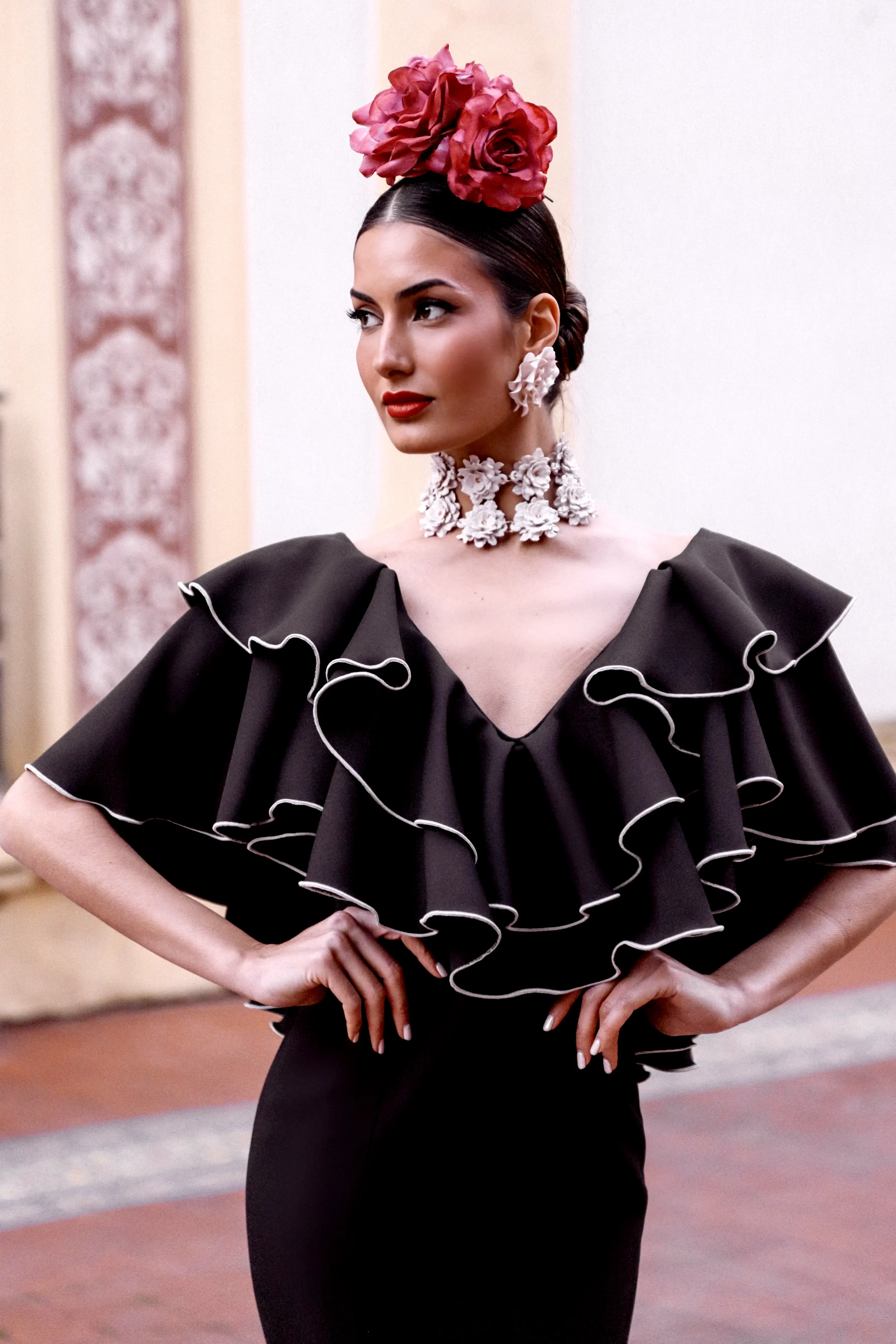 Traje con escote delantero pronunciado y escote trasero cerrado. Mangas con minivolante y único volante acabado en minivolante. Falda con primera subida iniciada en minivolante y segunda subida con doble minivolante. Diseñado y fabricado en España.