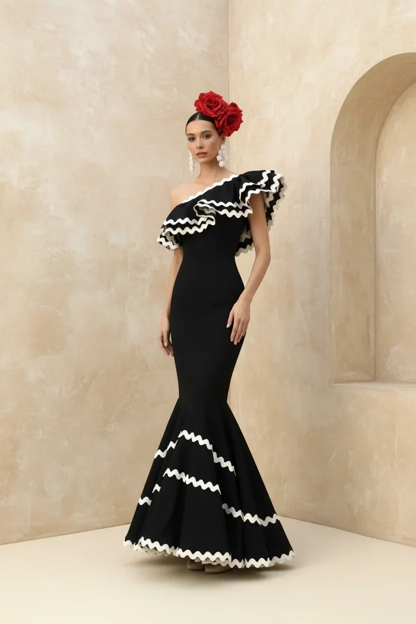 Traje con escote asimétrico con zig zag en beige o negro. Escote asimétrico con doble volante con zig zag. Falda con doble volante en capa, también con zig zag. Forro interior. Diseñado y fabricado en España.
