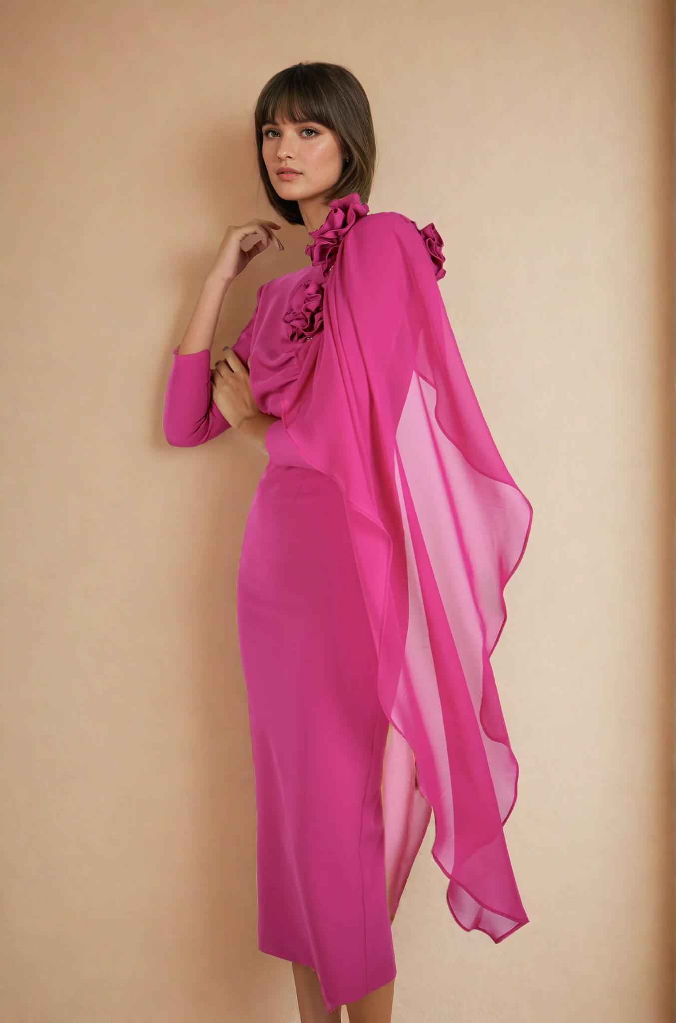 Espectacular vestido midi con adornos florales. Vestidos confeccionados y elaborados en España. Composición 100% poliéster.