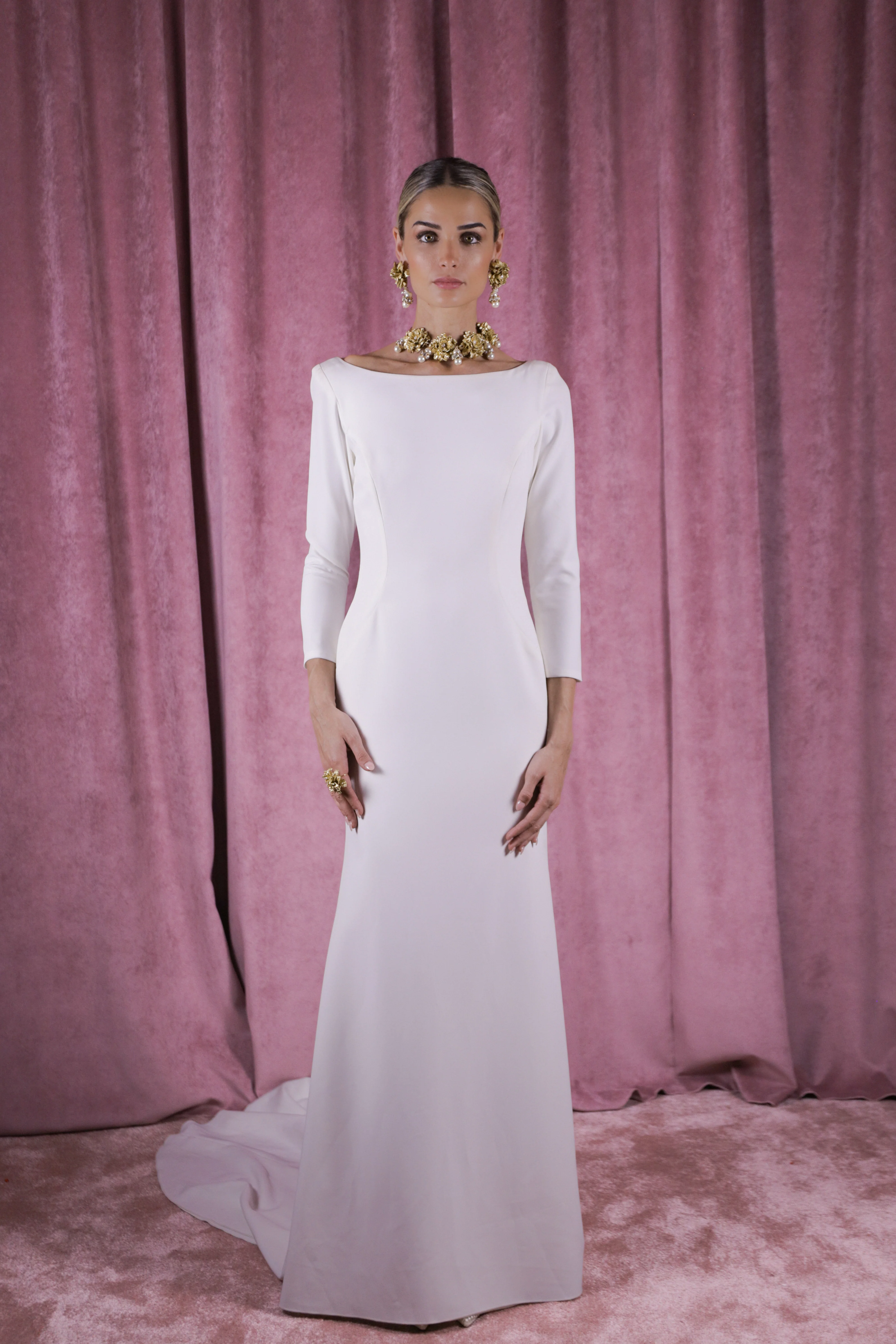 Elegante vestido de novia que resalta ligeramente la silueta, y escote barco. Mangas rectas hasta la muñeca. Escote en espalda abierto hasta la cintura con precioso bordado de flores, hecho a mano sobre tul. Forro interior.